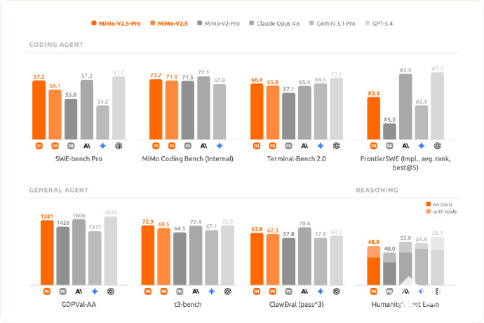 其中,MiMo—V2.5—Pro为旗舰型号,是小米当前最强模型,在通用智能体能力、复杂软件工程和长程任务处理方面已可与全球顶尖模型,如Claude Opus 4.6、GPT-5.4正面竞争。