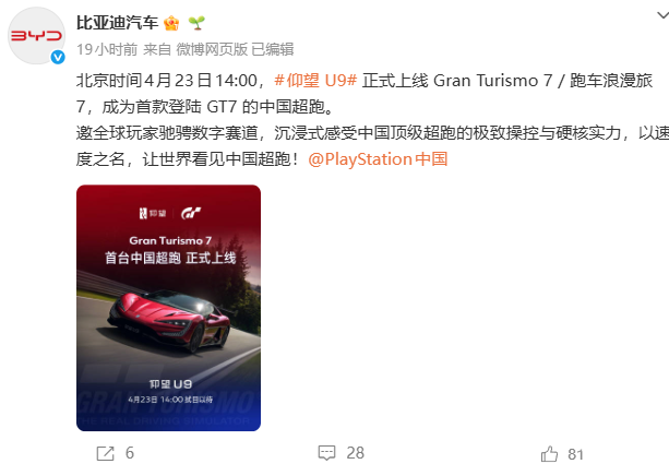PChome 4月23日消息,据比亚迪汽车官方微博,比亚迪旗下仰望U9现已正式上线《跑车浪漫旅7(GT赛车7)》,成为首款登陆该作的中国超跑。