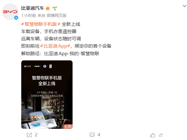 PChome 4月23日消息,今日,比亚迪汽车官方正式宣布,智慧物联手机版已全新上线。