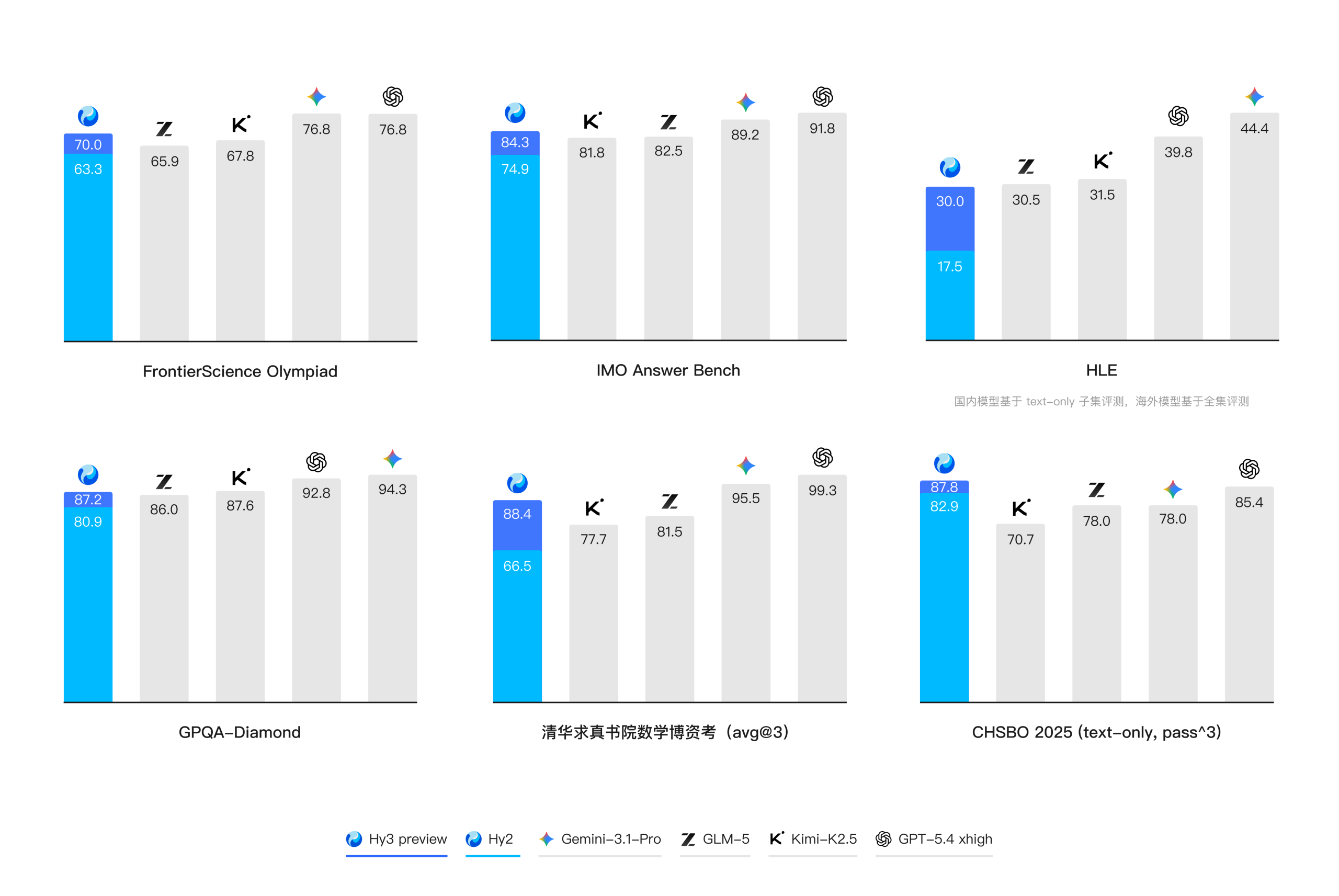 Hy3 preview采用快慢思考融合的混合专家架构,总参数量达2950亿,激活参数210亿,支持长达256K的上下文长度。该模型在多项高难度推理评测中表现突出,如在FrontierScience Olympiad、IMO Answer Bench等理工科推理任务,以及清华大学求真书院数学博资考、全国中学生生物学联赛中均取得优异成绩,展现出强大的泛化推理能力。