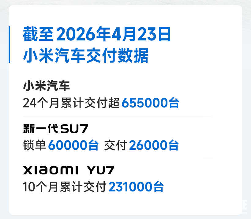 PChome 4月24日消息,小米汽车对外披露最新整体业务进展与产品规划,多项亮眼数据与重磅新品信息正式曝光。交付层面,截至2026年4月23日,小米汽车上市24个月累计交付量已突破65.5万台。其中新一代SU7目前锁单量达6万台,已完成交付2.6万台;上市仅10个月的小米YU7,累计交付也来到23.1万台,市场热度持续走高。