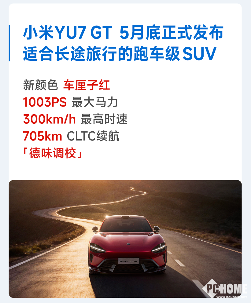备受期待的全新车型小米YU7 GT,确认将于今年5月底正式发布。定位跑车级SUV的它,主打长途旅行场景,新增专属车厘子红配色,拥有1003PS最大马力、300km/h最高时速以及705km CLTC续航,并搭载德味底盘调校。