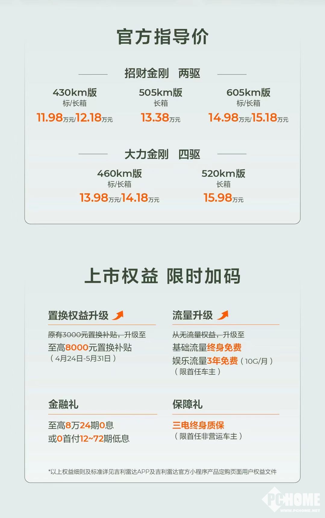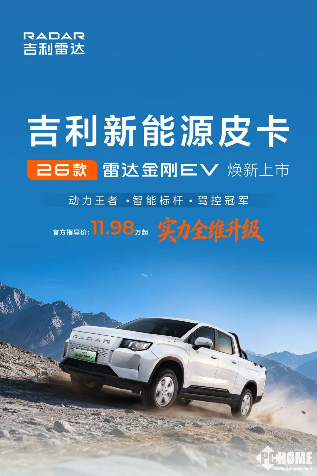 PChome 4月24日消息,在2026北京国际车展上,2026款吉利雷达金刚EV皮卡正式上市,官方指导价11.98万元起。新车定位全球家商两用超级纯电智能皮卡,分为“招财金刚”两驱与“大力金刚”四驱两大系列,共推出8款配置版本,续航里程覆盖430km至605km。