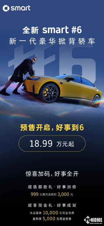 PChome 4月24日消息,今日,在2026北京国际车展上,全新smart精灵6号掀背轿车开启预售,预售价为18.99万元起,其意向金999元可抵3000元。