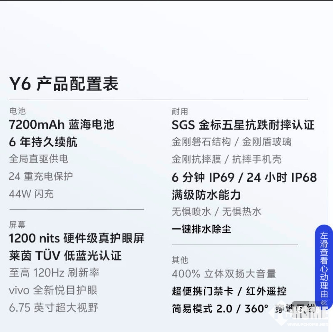 PChome 4月24日消息,vivo正式发布Y6 5G手机,主打7200mAh超大电池与IP69/IP68满级防水,起售价1799元。新机搭载第二代骁龙4芯片,配备6.75英寸720P LCD屏幕,支持120Hz高刷,已在京东开售。