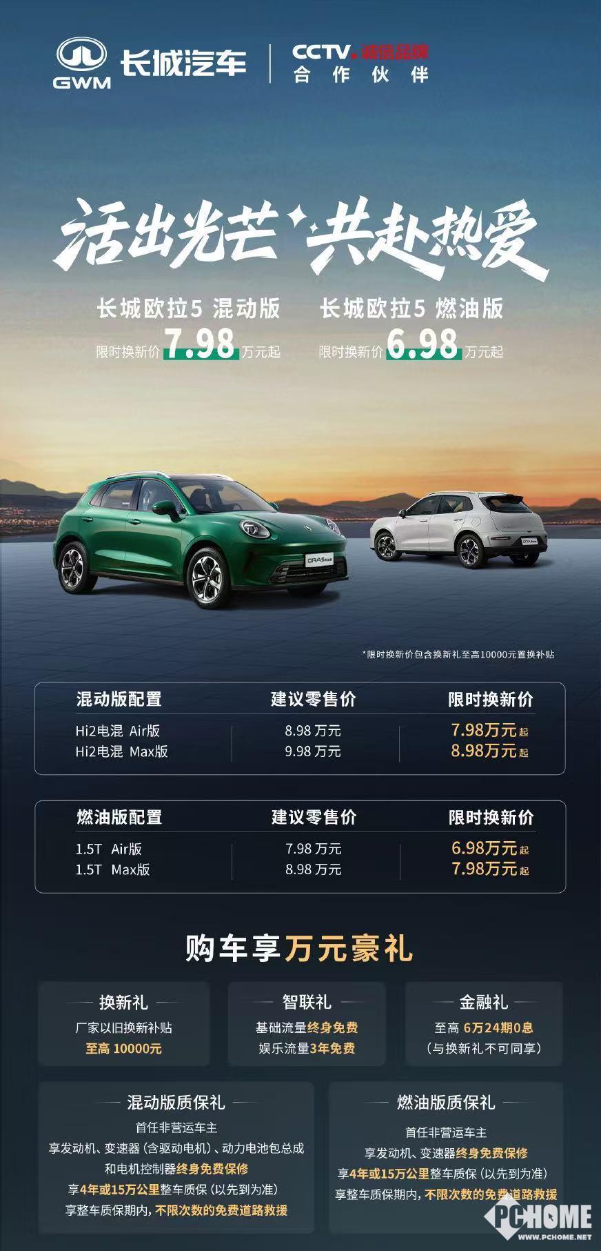 PChome 4月25日消息,长城欧拉5燃油版与混动版两款车型正式上市。新车凭借极具竞争力的定价策略迅速引发市场关注,其限时换新价低至6.98万元起,进一步丰富了品牌在紧凑型车市场的布局。