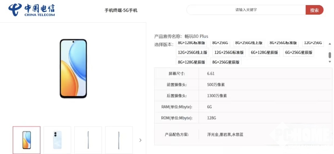 PChome 4月27日消息,型号为LAB-AN00的荣耀畅玩80 Plus手机现已现身中国电信终端产品库,拥有五种规格版本,并提供浮光金、墨岩黑、水悠蓝三种配色,产品零售价格尚未公布。