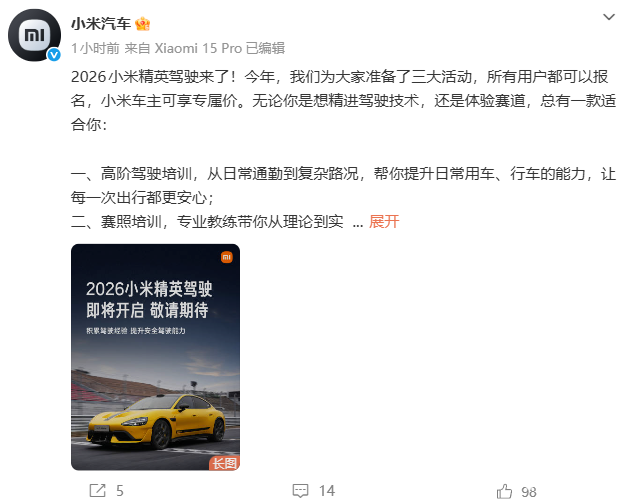 PChome 4月27日消息,今日,小米汽车宣布,2026小米精英驾驶活动即将开启,活动将陆续开放报名。