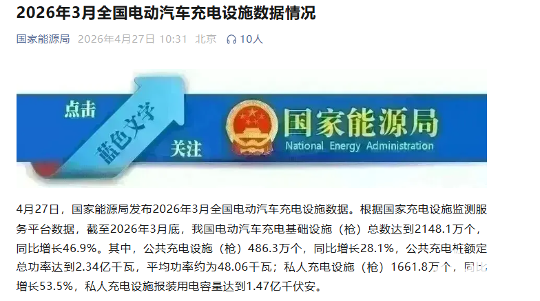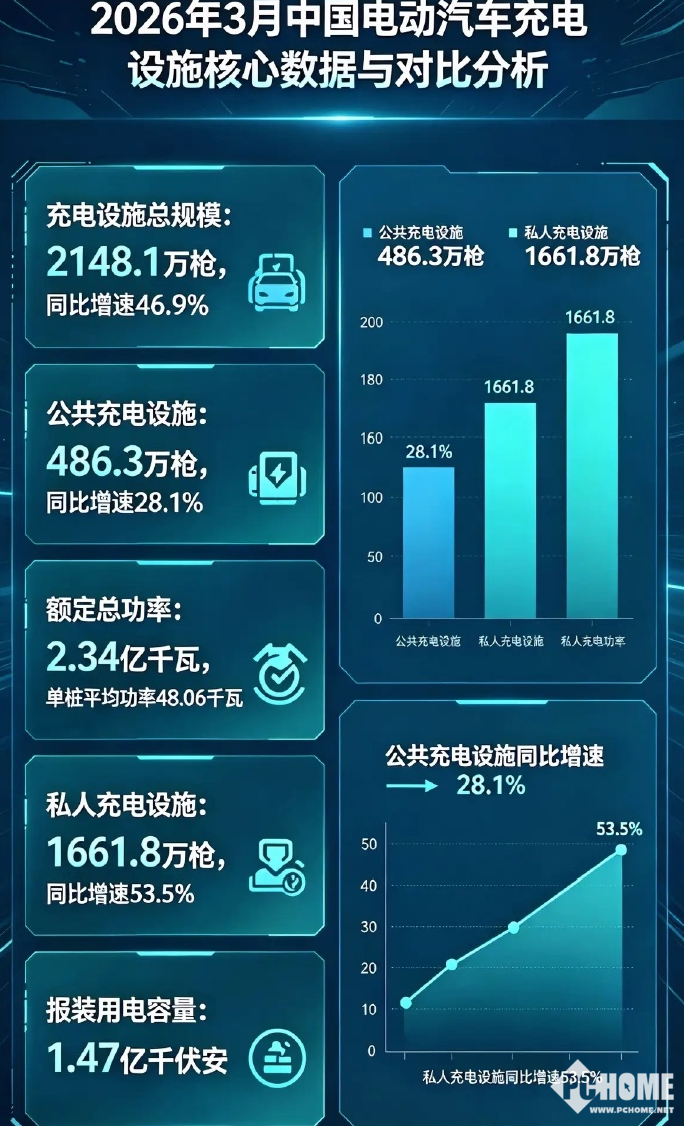 PChome 4月27日消息,今日,国家能源局发布了2026年3月全国电动汽车充电设施数据。截至今年3月底,我国电动汽车充电基础设施(枪)总数达到2148.1万个,同比增长46.9%。