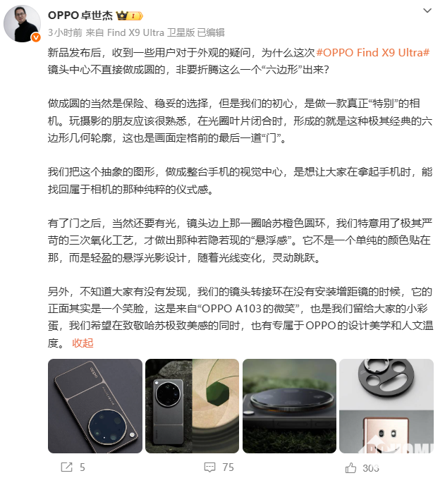 PChome 4月27日消息,今日,OPPO Find系列产品负责人卓世杰就OPPO Find X9 Ultra手机镜头中心的“六边形”设计进行回应,并称做成圆是保险、稳妥的选择,但是我初心是做一款真正“特别”的相机。