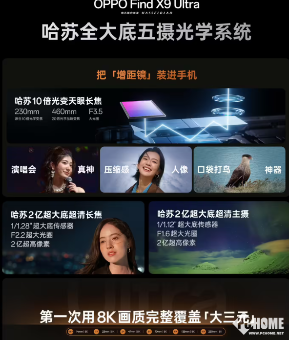 OPPO Find X9 Ultra后置搭载5000万像素14mm超广角、2亿像素23mm主摄、2亿像素70mm长焦、5000万像素230mm超长焦以及第二代丹霞色彩还原镜头,号称第一次用8K画质完整覆盖大三元。