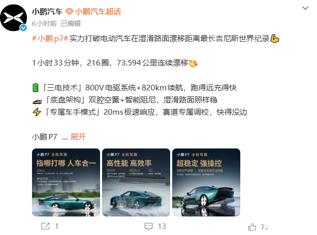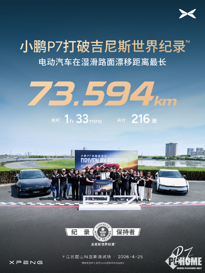 PChome 4月27日消息,今日,小鹏汽车官方宣布,小鹏P7打破了电动汽车在湿滑路面漂移距离最长吉尼斯世界纪录:距离73.594km、用时1h33mins、共计216圈。
