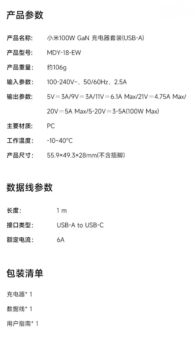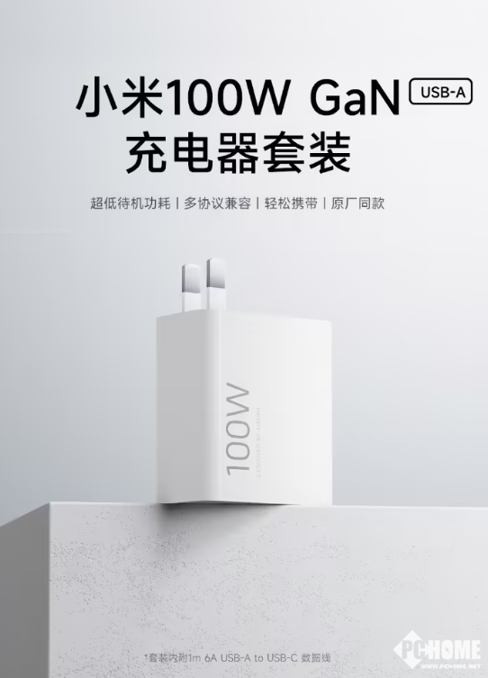 该产品采用单USB—A口高功率输出,可支持小米100W私有快充协议,同时兼容65W PD快充,可为小米手机、笔记本等设备提供高速充电。