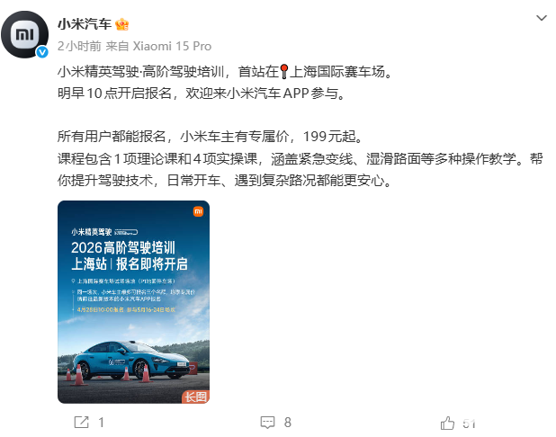 PChome 4月27日消息,今日下午,小米汽车官方宣布:小米精英驾驶 · 高阶驾驶培训,首站落地上海国际赛车场,明早10时开启报名。