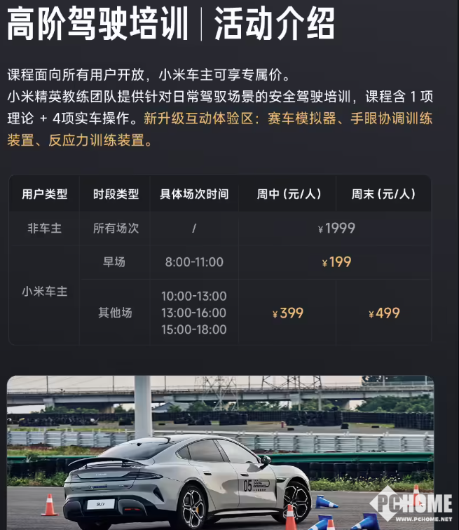 即小米车主可享受专属价,最低199元起,同一场次最多可报三个名额。课程由小米精英教练团队执教,并新增赛车模拟器、反应力训练等互动体验区。
