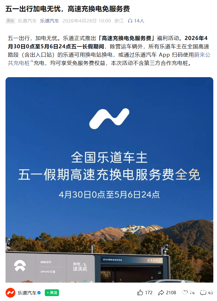 乐道汽车官方宣布,4月30日至5月6日开展面向全国非营运车主推出“高速换电充电免服务费”福利活动。
