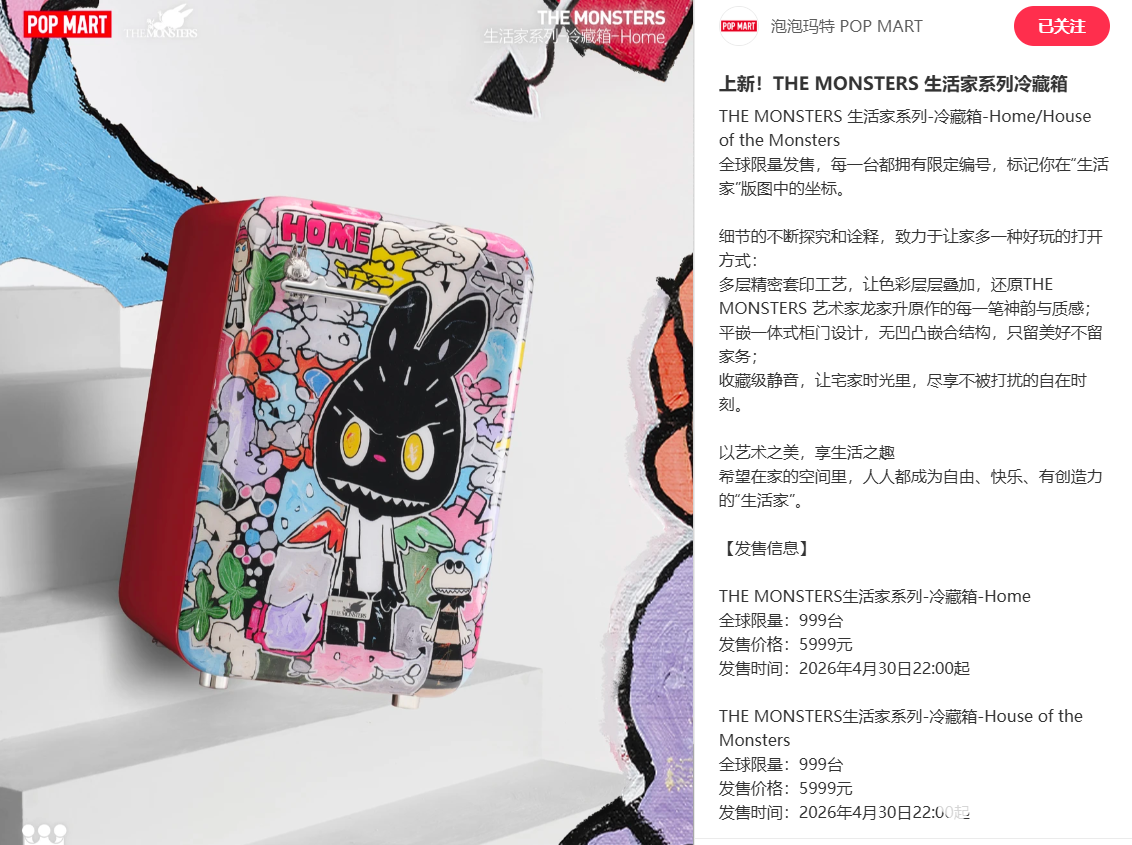 PChome获悉,泡泡玛特官方宣布,将发布首款家电产品THE MONSTERS生活家系列冷藏箱(LABUBU冰箱),一共推出两个版本,分别是Home款和House Of The Monsters款,售价为5999元,每款全球限量999台。