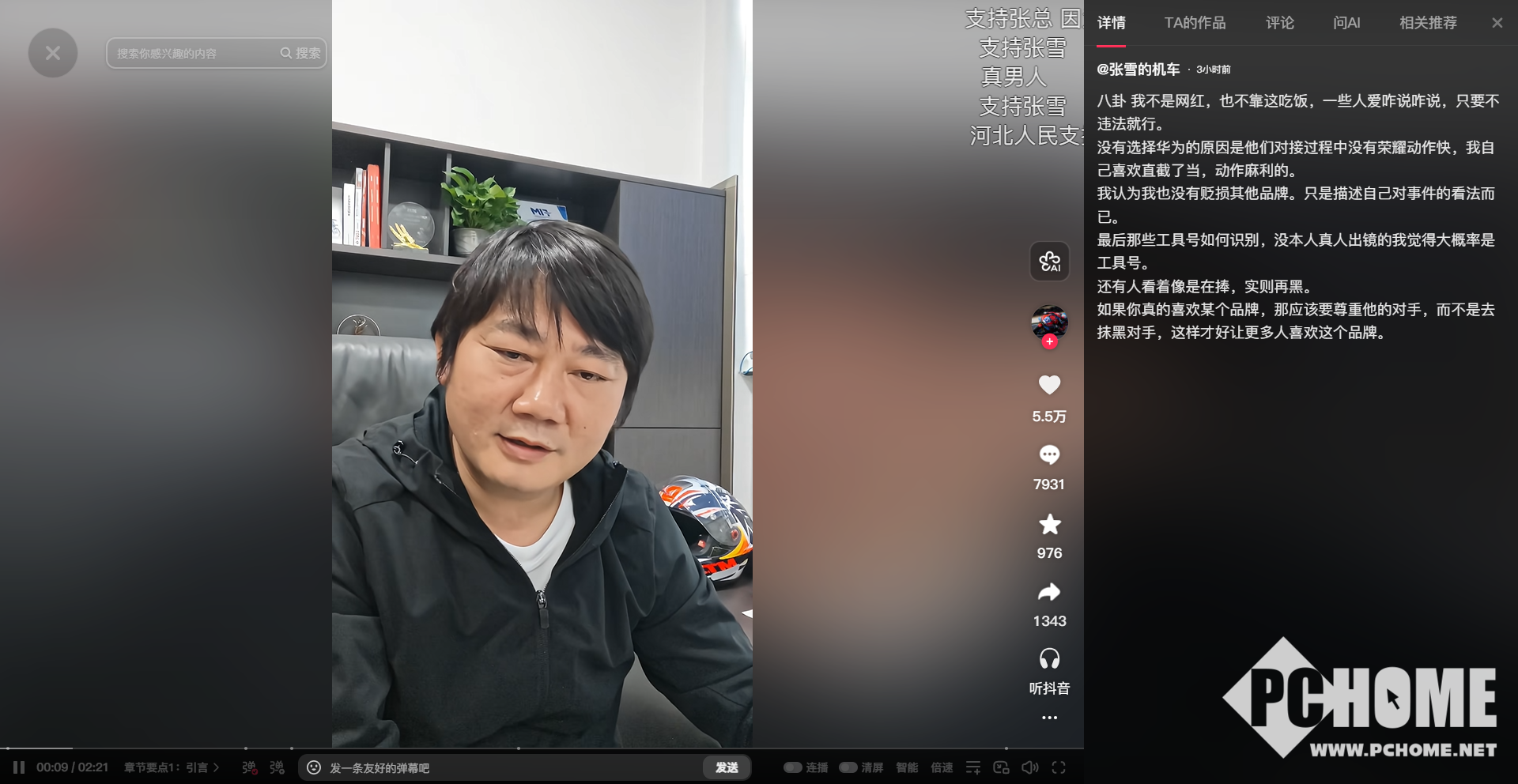 PChome 4月28日消息,张雪机车创始人张雪在社交平台发视频力挺余承东,他表示,看不惯网友的错误解读,自己纯粹因为看不惯而发声力挺,并不存在品牌合作的关系。张雪认为,自己不是网红,也不靠这吃饭。现在车队的赞助目前只保留4个,拒绝了很多的商务合作,并不需要所谓的“抱大腿”。自己几十年都是这个样子,更不需要打造人设。