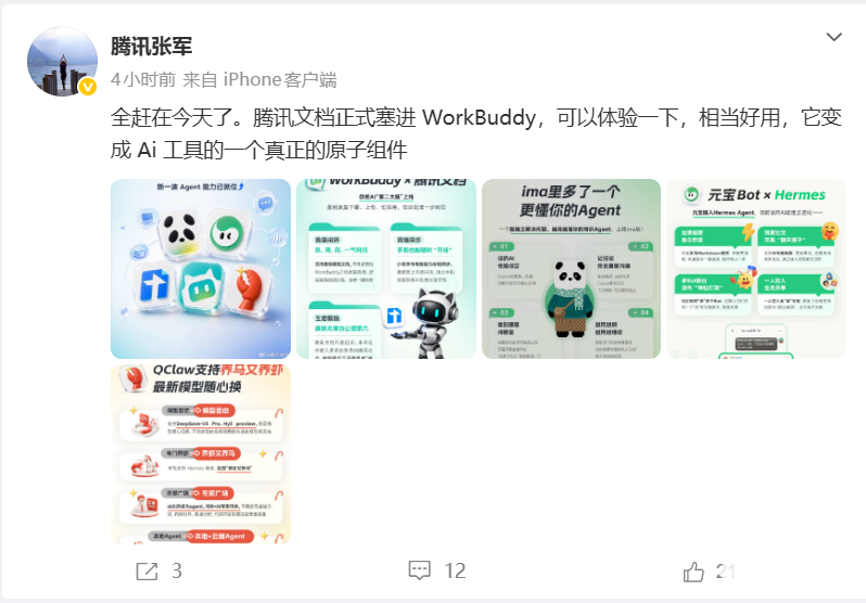 腾讯公司公关总监张军宣布,腾讯文档正式“塞进”旗下全场景AI智能体WorkBuddy,成为其一个真正的原子组件。