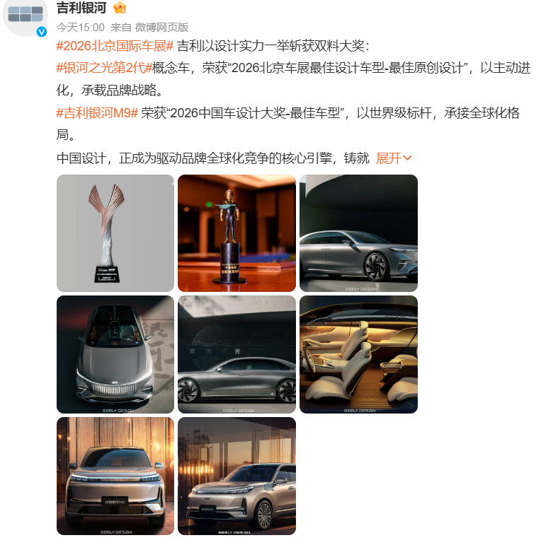 PChome 4月29日消息,今日,吉利银河官方宣布,吉利以设计实力一举斩获双料大奖:银河之光第2代概念车,荣获“2026北京车展最佳设计车型—最佳原创设计”;吉利银河M9荣获“2026中国车设计大奖—最佳车型”。