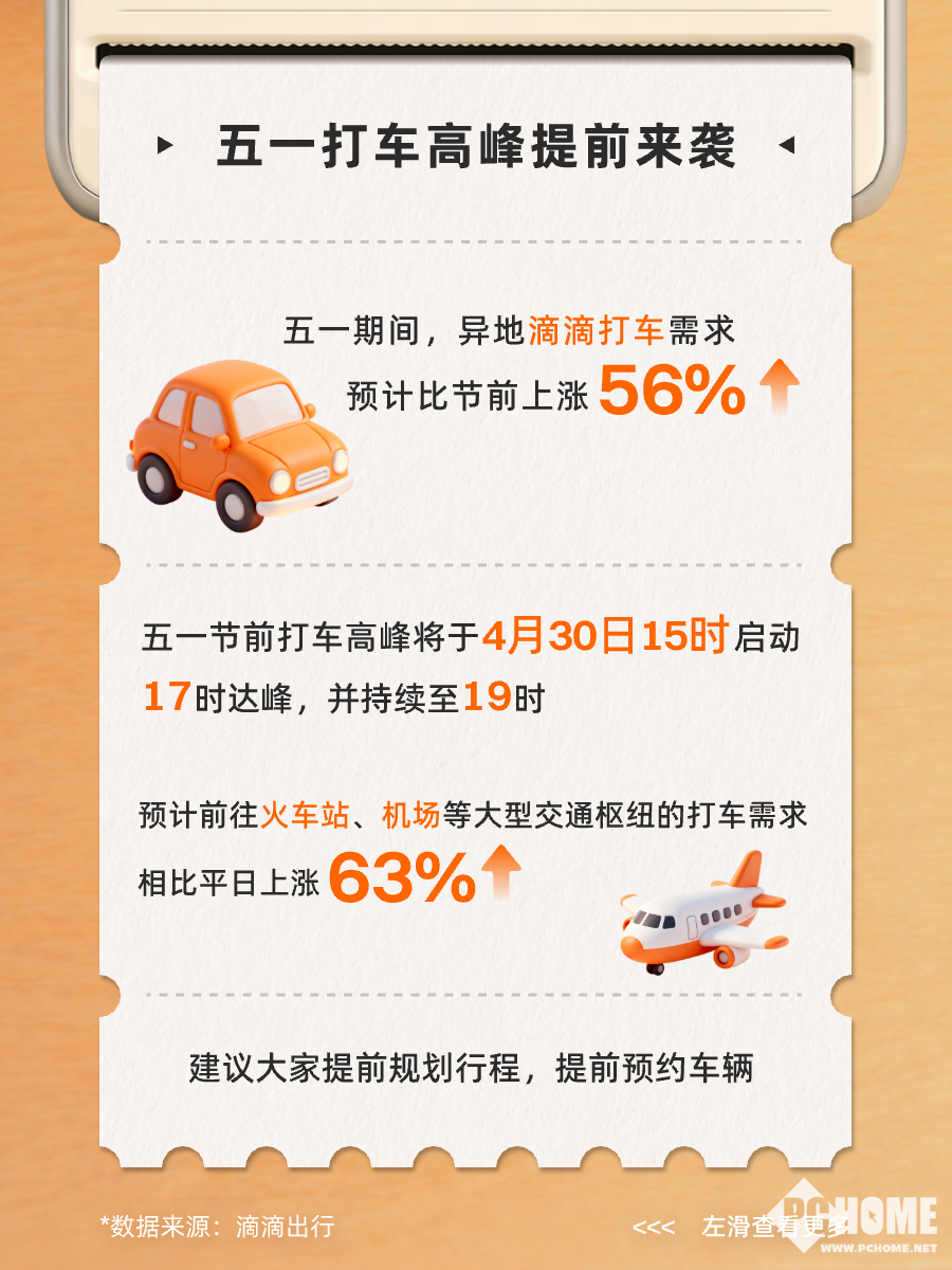 PChome 4月29日消息,随着五一假期临近,滴滴出行基于平台大数据发布出行预测报告,揭示今年假期出行新趋势。数据显示,五一期间异地打车需求预计较节前上涨56%,前往机场、火车站等大型交通枢纽的需求涨幅更高达63%。