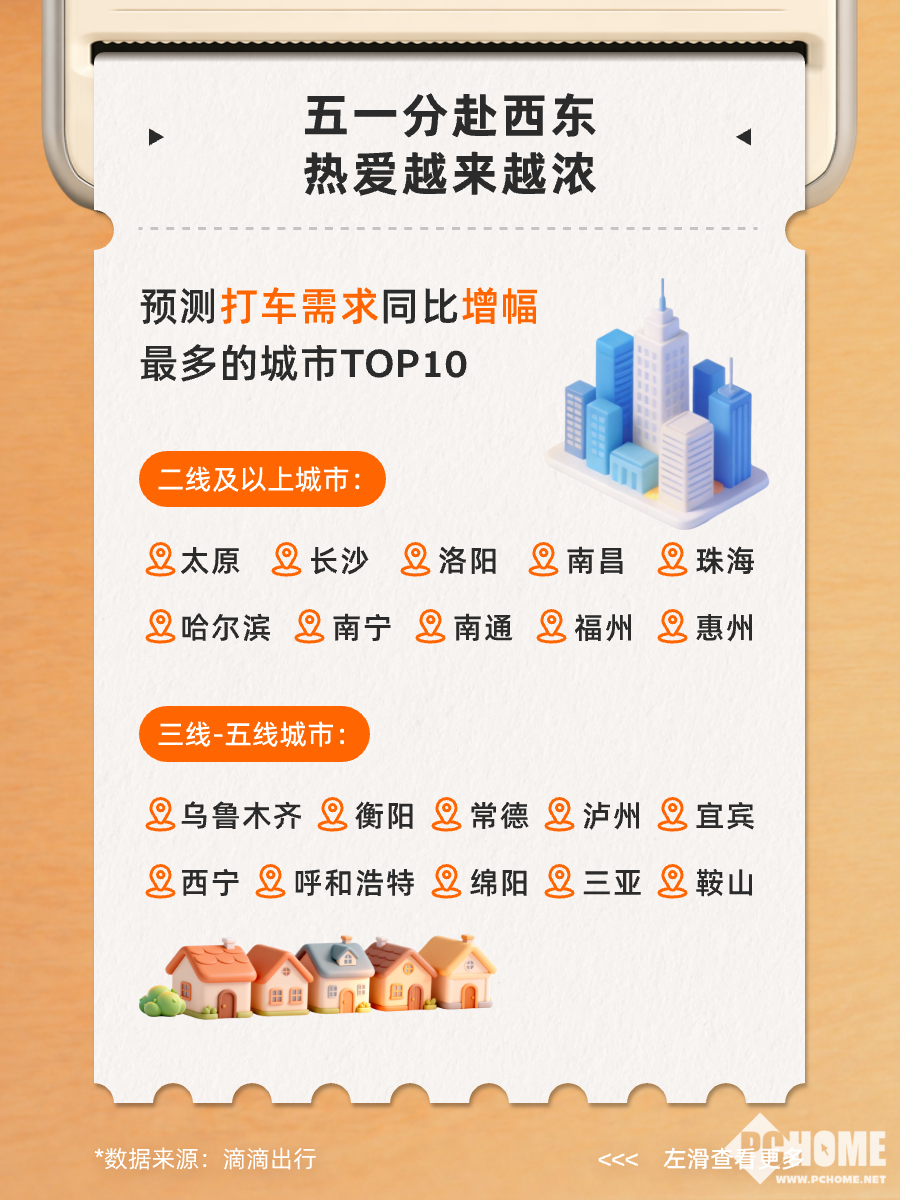 PChome 4月29日消息,随着五一假期临近,滴滴出行基于平台大数据发布出行预测报告,揭示今年假期出行新趋势。数据显示,五一期间异地打车需求预计较节前上涨56%。