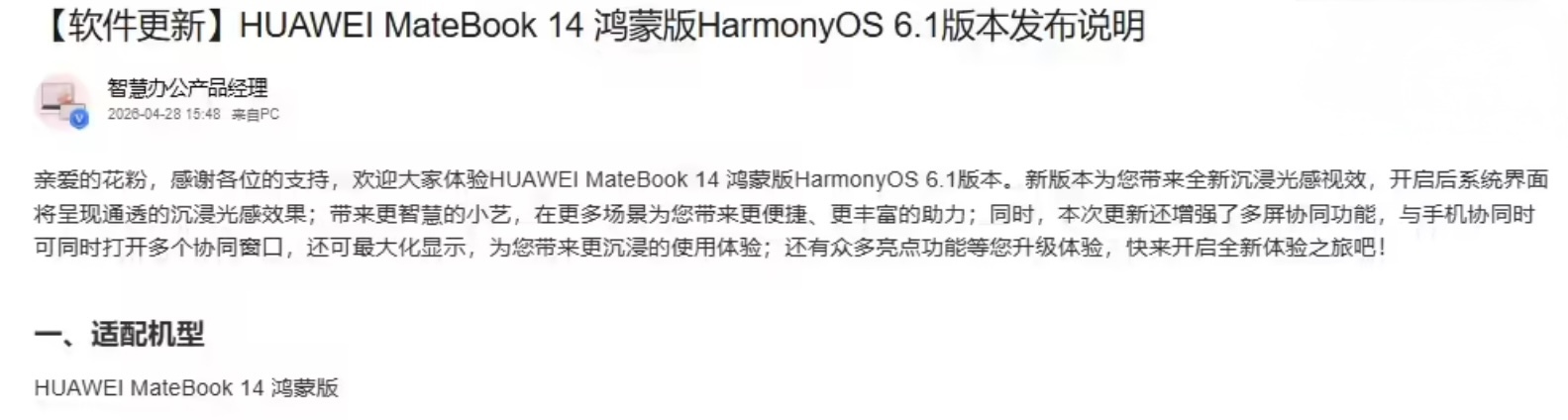 PChome 4月29日消息,据华为官方团队账号@智慧办公产品经理分享,MateBook 14鸿蒙版电脑已发布HarmonyOS 6.1版本升级,并带来了全新沉浸光感视效、更智慧的小艺,同时还增强了多屏协同等功能。