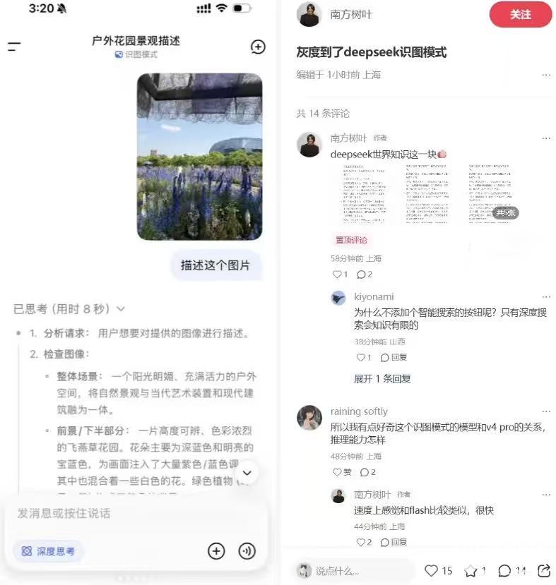 据网友今日晒出的图片了解到,灰度到的用户可以上传一张图片,让DeepSeek描述这张图。有网友称“速度上感觉和flash比较类似,很快”。还有网友显示可触发识图模式界面,但无法使用,提示“识图模式暂不可用,请稍后再试”。
