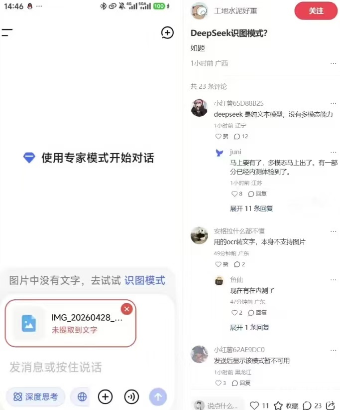 PChome 4月29日消息,据多方消息证实,DeepSeek正在进行灰度测试“识图模式”,该模式和“快速模式”“专家模式”并列,并非简单的OCR文字,而是终于具备了多模态识别能力。