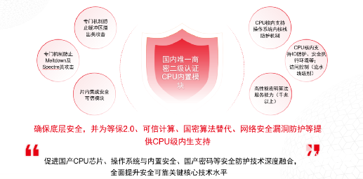专门机制防止“幽灵”与“熔断”攻击,集成安全可信、商用密码模块。