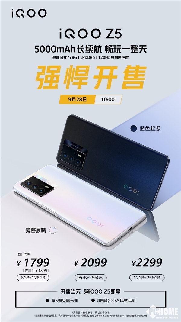 今日上午10点,iQOO Z5正式开售,提供薄暮晨曦、造梦空间、蓝色起源三种配色,8+128版1799元,8+256版2099元,12+256版2299元。iQOO产品经理@戈蓝V介绍,iQOO Z5是“安卓续航王者”,性能先锋,拥有5000mAh超大电池,支持44W闪充,可供打游戏10.4小时,看视频18.3小时。