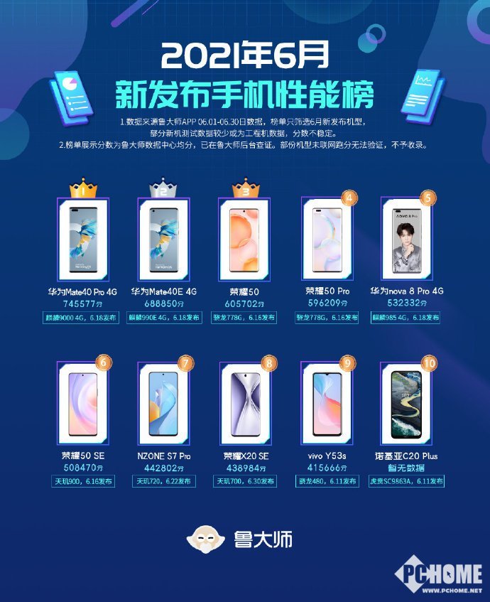 今日,鲁大师公布了今年6月份新发布手机性能排行榜,其中华为Mate40 Pro 4G以745577性能均分一举夺冠,同门兄弟——华为Mate40E 4G以688850分紧随其后,位居第二,而前不久首发搭载骁龙778G的荣耀50取得性能均分605702分,占得榜单第三的席位。