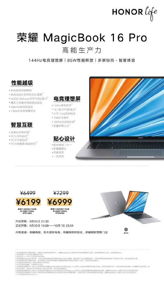 为发挥出144Hz高刷新率的优势,荣耀MagicBook 16 Pro锐龙版最高可选择英伟达新推出的GeForce RTX 3050独立显卡,该显卡搭载全新RT Core、 Tensor Core及SM多单元流处理器,同时还支持光线追踪技术和DLSS技术,能让你在游戏过程中有更流畅和逼真的体验。同时,该机全系搭载了采用AMD最新的ZEN3架构打造的锐龙R7 5800H标压处理器,其拥有8核心16线程,最高睿频可达4.4GHz,同时还支持双烤下85W(CPU 35W+GPU 50W)的强劲性能释放,无论是LOL、DOTA2这类主流网游,还是PS、Pr这类比较吃性能的软件,该机运行起来都毫无压力。
