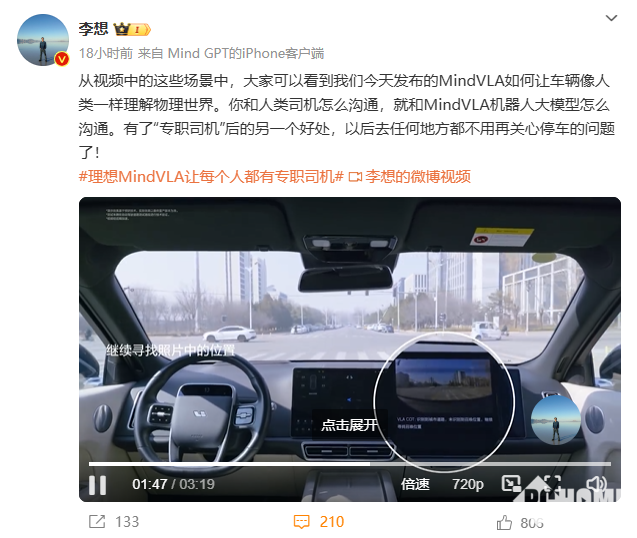随后,李想在微博展示了一段视频,表示“从视频中的这些场景中,大家可以看到我们今天发布的MindVLA如何让车辆像人类一样理解物理世界。你和人类司机怎么沟通,就和MindVLA机器人大模型怎么沟通。有了“专职司机”后的另一个好处,以后去任何地方都不用再关心停车的问题了!”