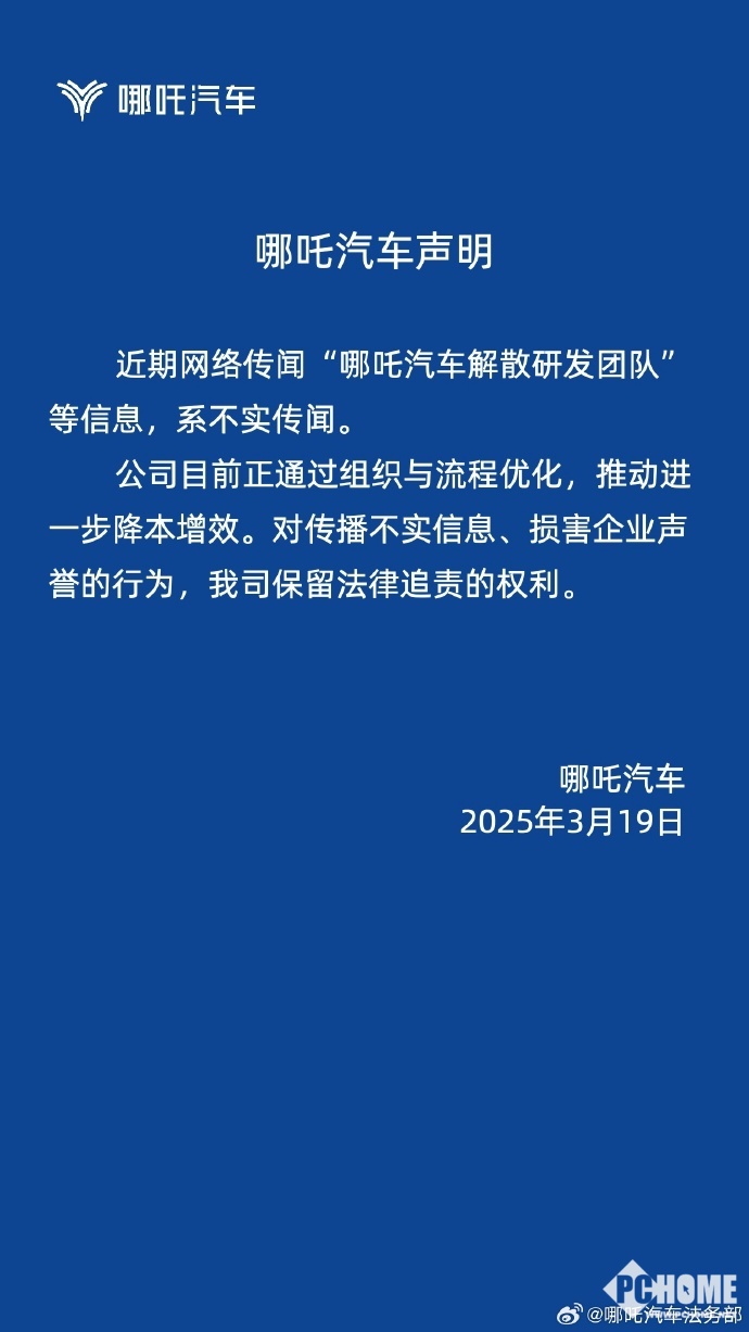 哪吒汽车在声明中表示,公司目前正通过组织与流程优化,推动进一步降本增效。这一系列举措旨在提升企业运营效率、缓解资金压力,而非解散研发团队。同时,哪吒汽车强调,对于传播不实信息、损害企业声誉的行为,将保留法律追责的权利。