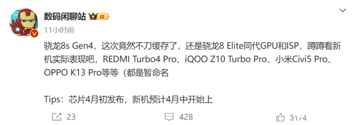 3月25日消息,微博博主爆料称,高通骁龙8s Gen4将于4月初正式发布,届时4月中,首批搭载高通骁龙8s Gen4的新机将亮相,机型分别是REDMI Turbo 4 Pro、iQOO Z10 Turbo Pro、小米Civi 5 Pro、OPPO K13 Pro等。