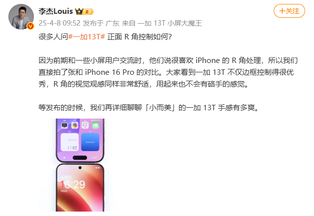 4月8日消息,一加中国区总裁李杰发微博称,因为前期和一些小屏用户交流时,他们说很喜欢iPhone的R角处理,所以我们直接拍了张和iPhone 16 Pro的对比。大家看到一加13T不仅边框控制得很优秀,R角的视觉观感同样非常舒适,用起来也不会有硌手的感觉,并称真机手感会很好。