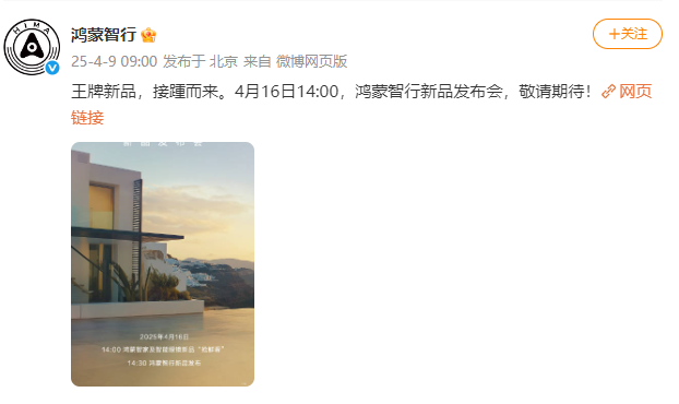 4月9日,鸿蒙智行官方微博发布了鸿蒙智行新品发布会时间,新品发布会定档于4月16日下午14:00。据了解,全新问界M8和享界S9增程版将会是此次新品发布会的主角,届时除了车品之外,还会发布智能各类loT设备,智能眼镜新品也会在此发布会上曝光。