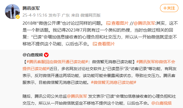 4月9日,腾讯公司公关总监张军回复微博称,微信不会提供“已读显示”功能,随后。腾讯张军表示,2023年7月就有过一个类似的热搜,当时也做过相关的回复,2018年“微信公开课”也讨论过同样的问题。“已读”会增加信息接收者的心理负担和社交压力,所以从一开始微信就坚定不移地不提供这个功能,以后也不会。