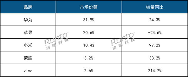 2024年,成人智能手表在传统主流电商销量941.7万台,销售额129.6 亿元,销量前五品牌为华为、苹果、小米、荣耀和 vivo,合计占68.6%份额。华为销量同比增长24.3%,以31.9%份额反超苹果位列第一,苹果线上销量同比下降24.6%。