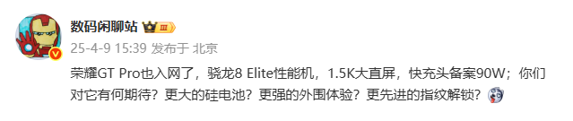 4月9日消息,知名科技博主爆料,荣耀GT Pro获入网备案,据此前曝光信息,荣耀GT Pro配备6.78英寸1.5K分辨率OLED屏幕,具备荣耀AI护眼功能。电池容量应该超过6000mAh,支持90W有线快充。