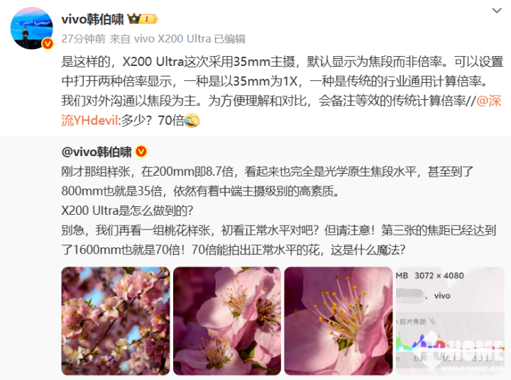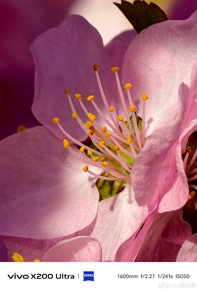 4月10日,vivo通信科技有限公司产品经理韩伯啸在其社交媒体发布了vivo X200 Ultra的长焦样张,据韩伯啸介绍,X200 Ultra在8.7倍(200mm)变焦场景下做到了光学原生焦段水平,甚至在35倍(800mm)变焦场景下,X200 Ultra依然有着中端主摄级别的高素质表现。更夸张的是,在70倍(1600mm)变焦场景下,花瓣的纹理、光影细节清晰呈现,堪称是机圈“超远摄之王”。