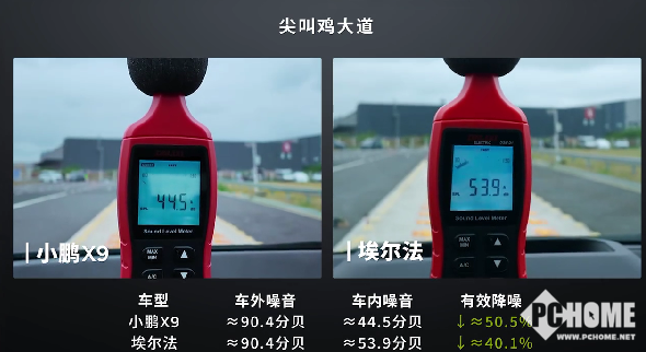 在尖叫鸡挑战中,测试团队把两排尖叫鸡平铺在路面上,两车先后以15km/h的速度,从尖叫鸡上压过,车外噪音达到90.4分贝,经检测,小鹏X9车内噪音44.5分贝,丰田埃尔法53.9分贝,小鹏X9有效降噪50.5%,比埃尔法高出10%,小鹏X9胜。