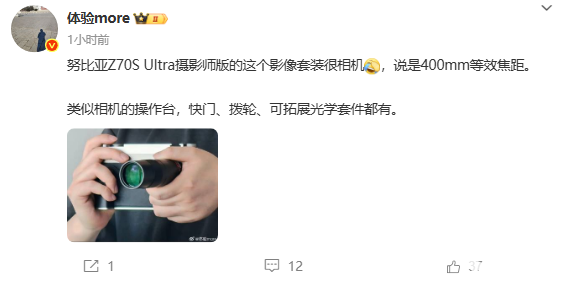 4月10日消息,努比亚Z70S Ultra摄影师版影像套装目前已在互联网平台曝光,博主@体验more 发文称,该套装支持 400mm 等效焦距,拥有类似相机的操作台,快门、拨轮、可拓展光学套件。