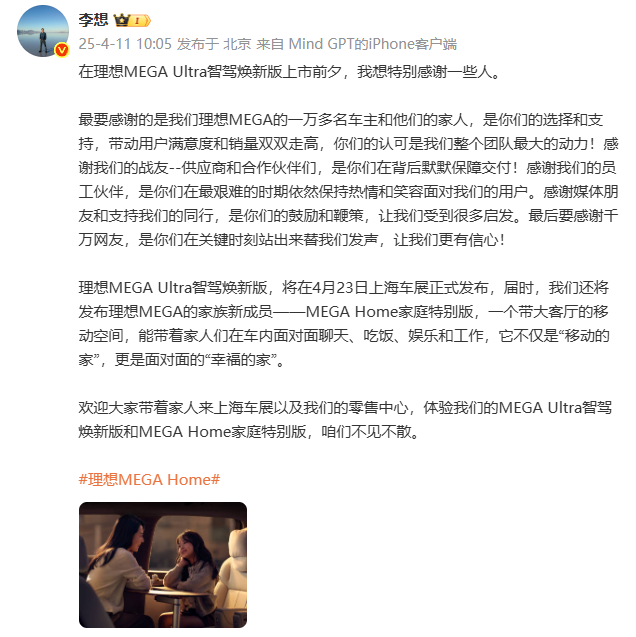 4月11日消息,理想汽车CEO李想在微博宣布,理想MEGA Ultra智驾焕新版将于4月23日在上海车展正式发布,届时,还将发布理想MEGA的家族新成员——MEGA Home家庭特别版,一个带大客厅的移动空间,能带着家人们在车内面对面聊天、吃饭、娱乐和工作,它不仅是“移动的家”,更是面对面的“幸福的家”。