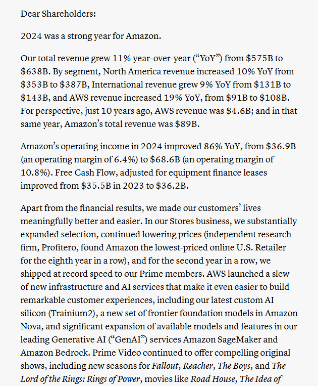 4月11日消息,亚马逊CEO Andy Jassy安迪・贾西在亚马逊年度致股东信中表示,亚马逊今年计划的资本支出高达1000亿美元,其中大部分将用于AI相关项目,包括数据中心、网络设备、AI硬件,以及生成式AI服务能力建设。