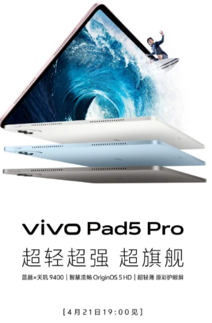 据了解,vivo Pad5 Pro平板尺寸为13英寸,重约578g,OriginOS 5 HD系统,支持PC级WPS+AI文档生产力。新机配备至高1200nit高亮原彩护眼屏,自研双侧入光,搭载蓝晶×天玑9400,12050mAh电池容量,超长待机70天,新机将会在4月21号新品发布会上亮相。