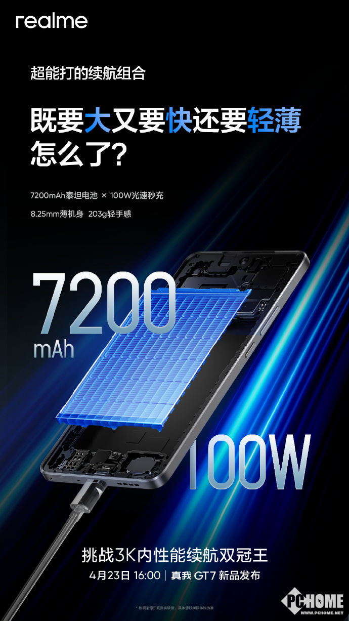 2025年4月14日,realme真我官微发布消息称,真我GT7续航超能打,搭载7200mAh泰坦电池+100W光速秒充,用得久充得快。
