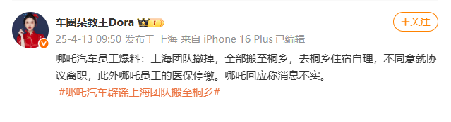 微博上有博主爆料称,哪吒汽车员工:上海团队撤掉,全部搬至桐乡,去桐乡住宿自理,不同意就协议离职,此外哪吒员工的医保停缴。哪吒汽车回应称:消息不实。近日网上传出视频,自称哪吒汽车经销商齐聚哪吒桐乡工厂门前追债。