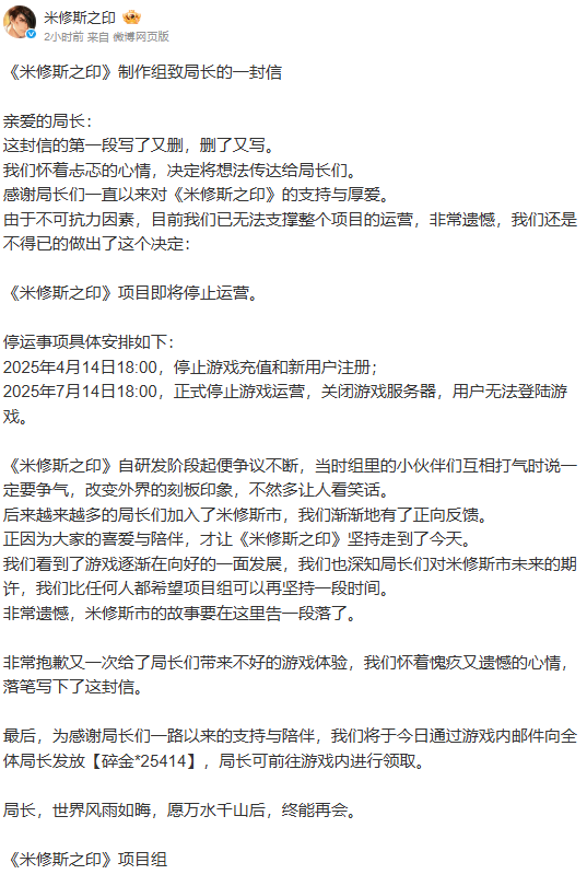 以末世为背景的恋爱冒险手游《米修斯之印》今日宣布将停止运营,将于今日18:00停止游戏充值和新用户注册,7月14日18:00正式停止游戏运营,关闭服务器,用户无法登录游戏。